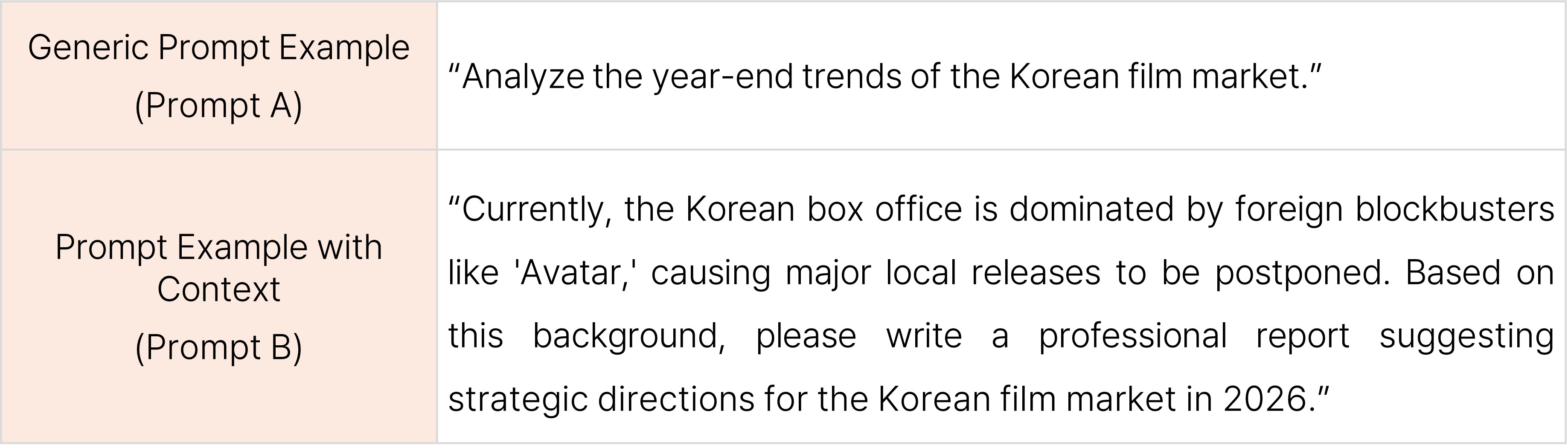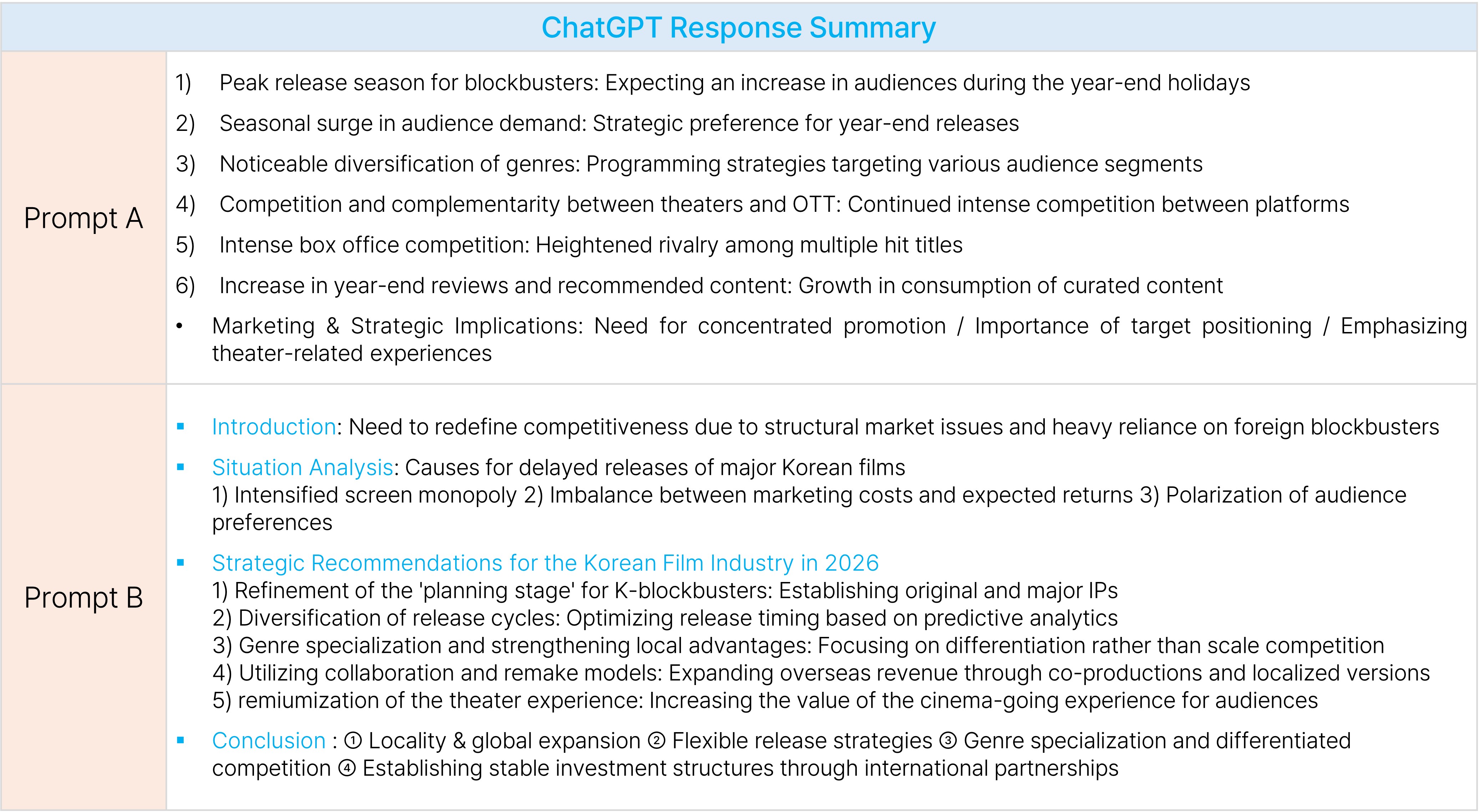 Since both requested an analysis, the responses were quite detailed, but their depth differed significantly. Prompt A provided a brief overview of the general atmosphere of the Korean film market during the year-end season. It categorized the market trends into six points and touched lightly on marketing and strategic implications for both theaters and OTT platforms.