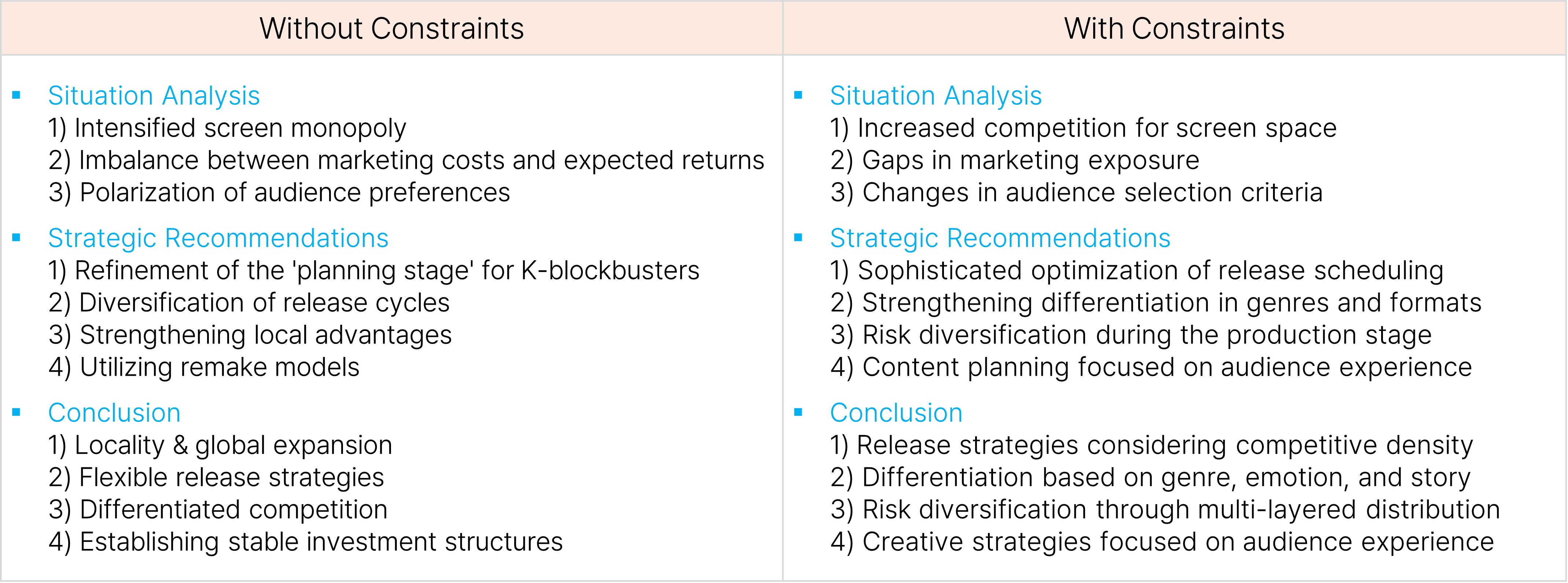 Comparing the results reveals a clear difference. When Constraints were applied, the language became more refined and the content felt more stable. For example, instead of using definitive or potentially risky terms like "Polarization of audience preferences" or "Imbalance of expected returns," the AI adopted more conservative and balanced phrasing such as "Changes in audience selection criteria" or "Gaps in marketing exposure".