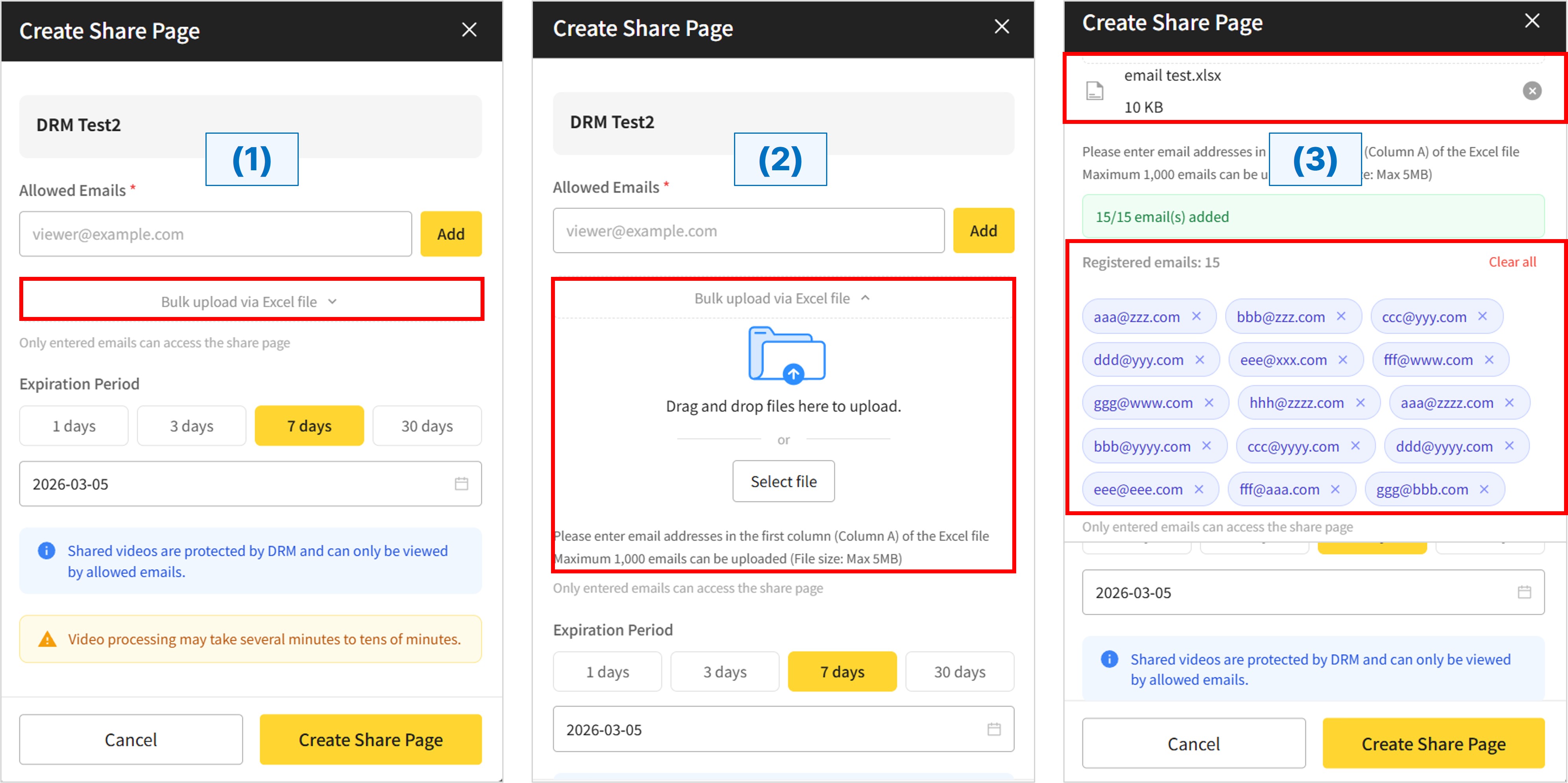Access to video share pages is restricted to "Allowed Emails" only. With this update, we have introduced a "Bulk upload via Excel file" feature to streamline the registration process.