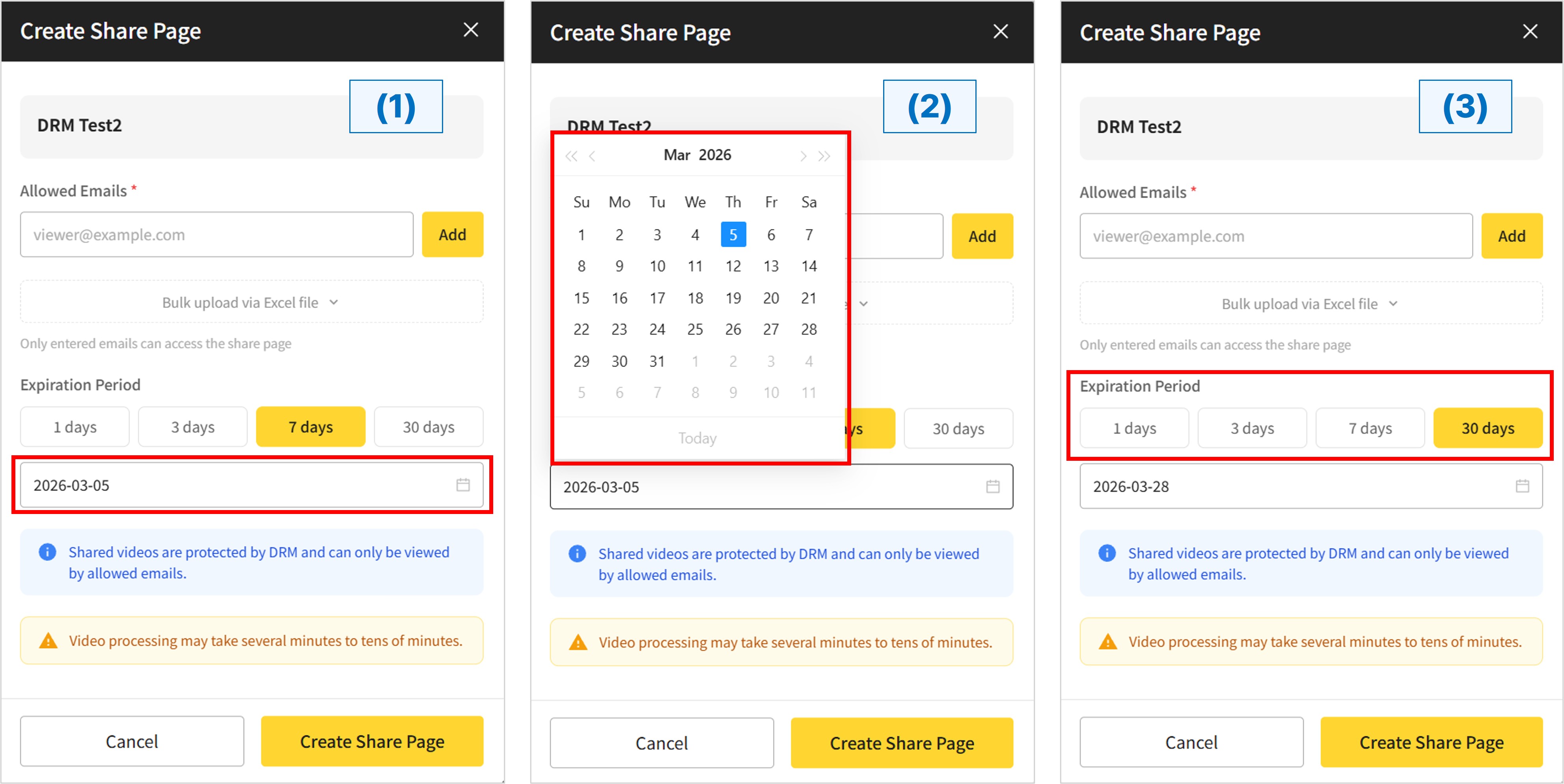 When creating a video share page, you can set an expiration date along with email registration. Previously, users could only choose from preset options: 1 day, 3 days, 7 days, or 30 days. We have now added a Calendar feature, allowing you to specify a precise expiration date with greater flexibility.