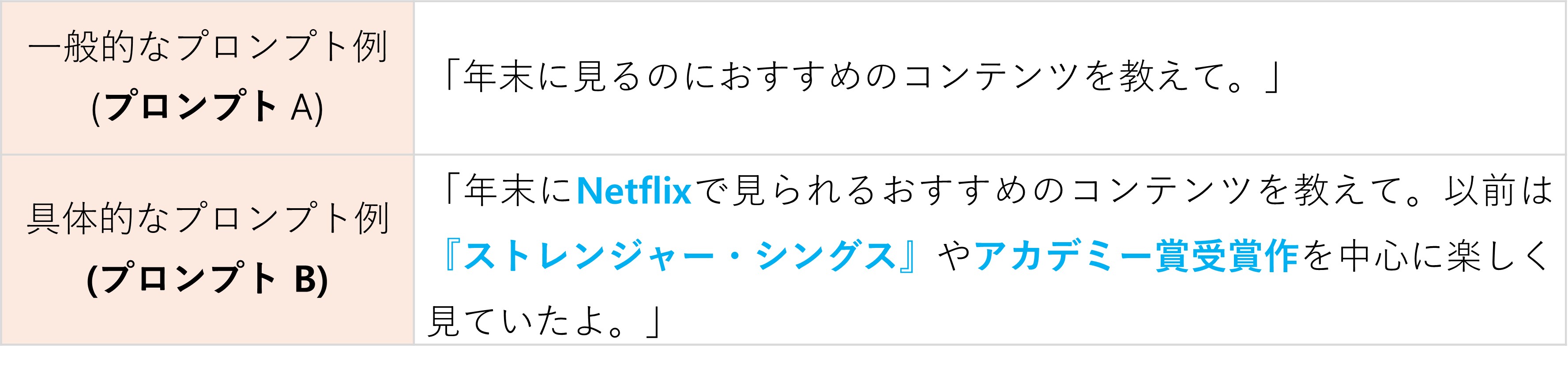 一方で、以前楽しんだ特定のコンテンツ(『ストレンジャー・シングス』)や『アカデミー賞受賞作』に言及し、視聴プラットフォームを【Netflix】に限定した場合(プロンプト B)、AIはユーザーの好みや要求を反映した、よりパーソナライズされた(Personalized)提案を行いました。