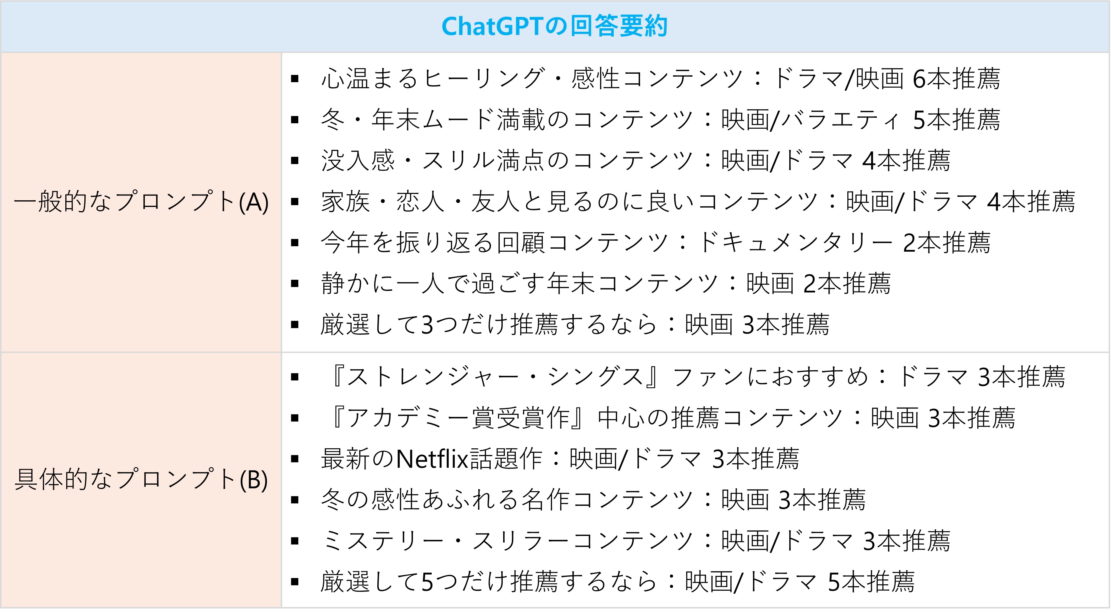 ChatGPTにどのように依頼したかによって、結果には大きな差が出ました。特別な条件を与えず、単純にコンテンツの推薦を求めた場合(プロンプト A)、AIは「心温まるヒーリング系」「冬」「年末のムード」など、汎用的な分類基準に基づいた多様なジャンルを提案しました。