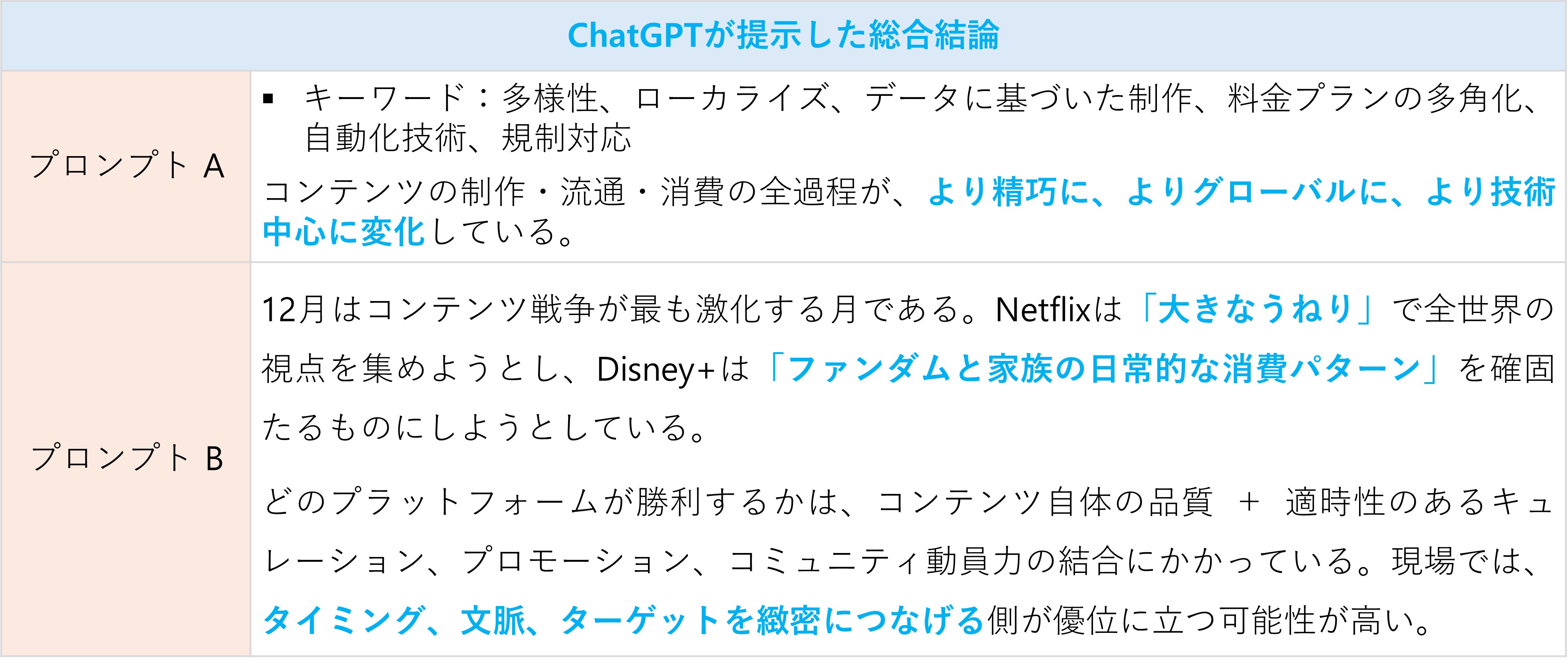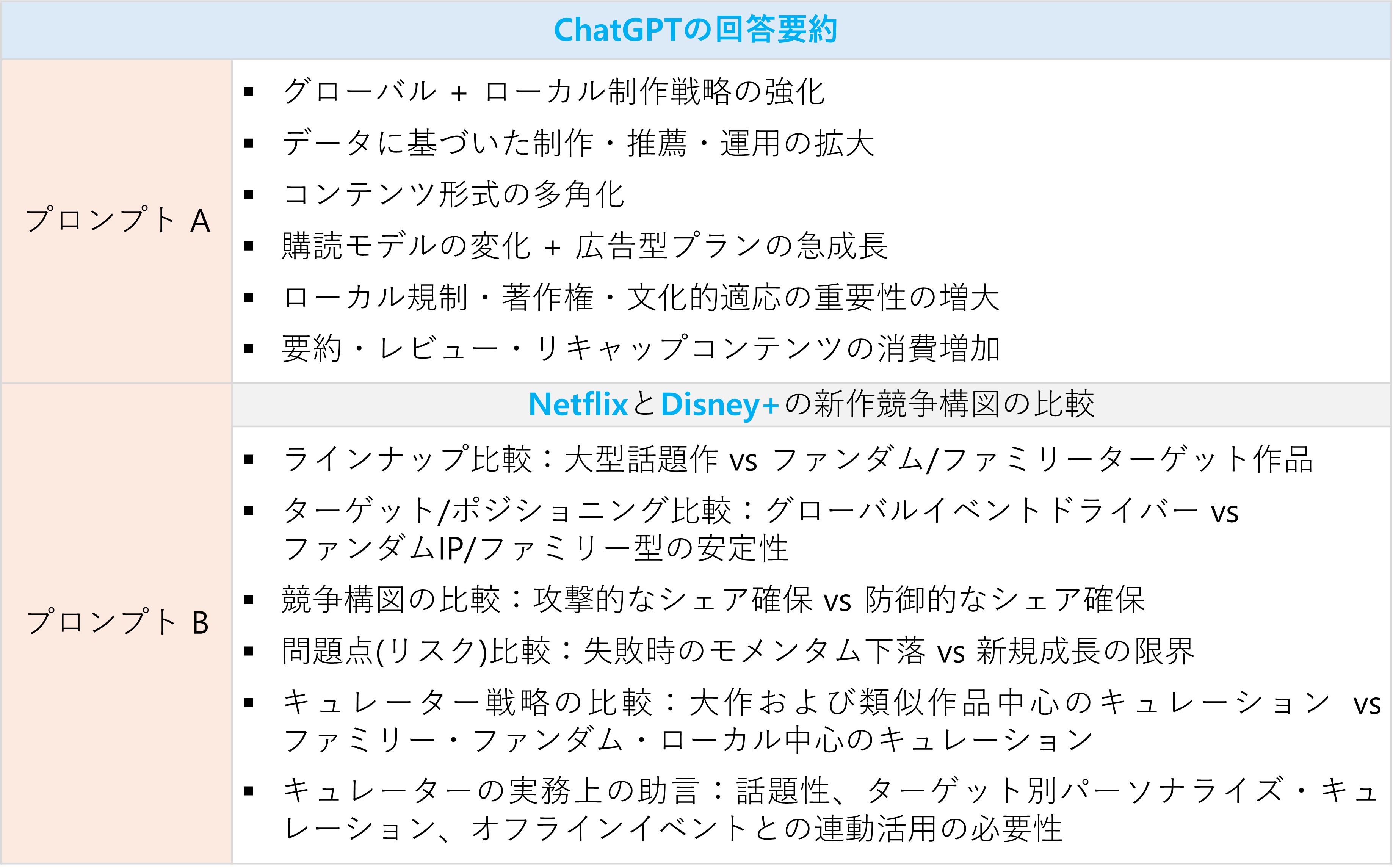 一方、プロンプトB(具体的なプロンプト)は、Netflix対Disney+の競争構図を中心に、新作ラインナップを交えた具体的な分析結果を提供してくれました。