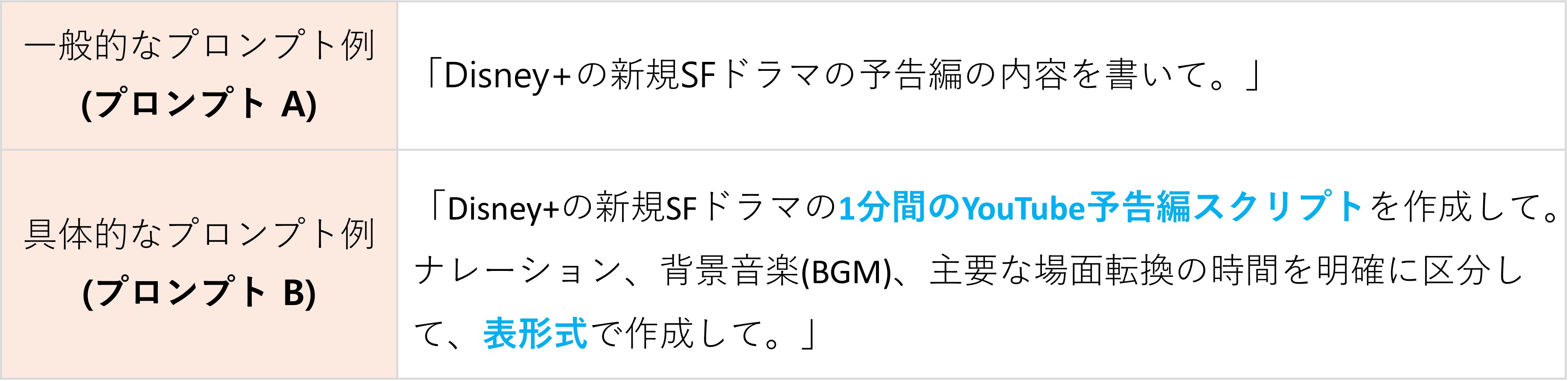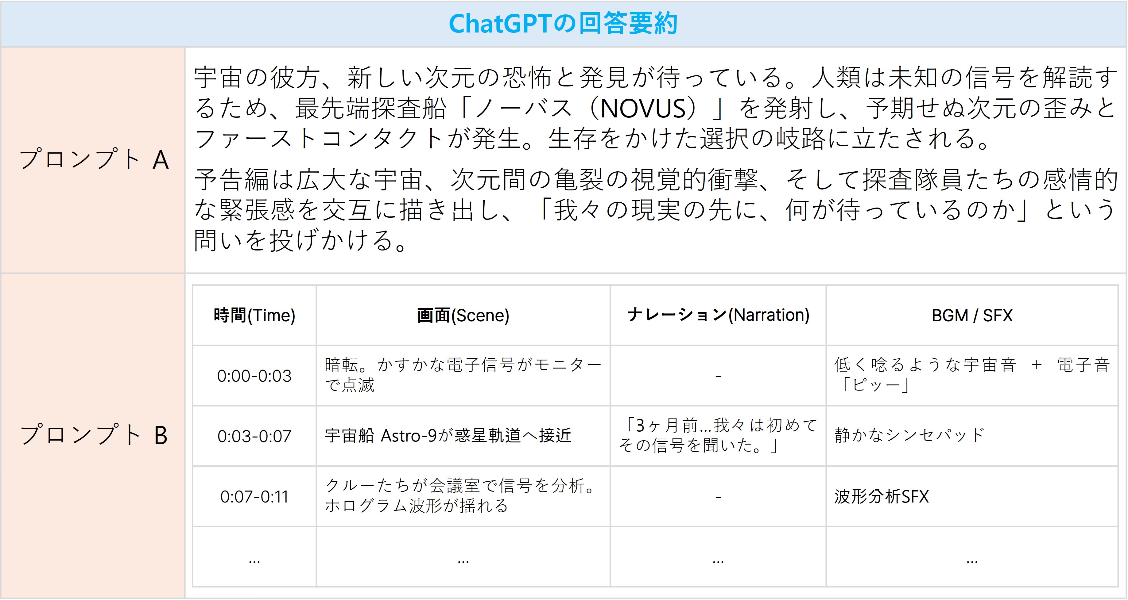 プロンプトBも同様に架空の予告編を作成していますが、「1分間のYouTube予告編」という具体的な目的に加え、時間帯別の画面構成、ナレーション、効果音を含む「表形式」という明確な構造を設計しています。