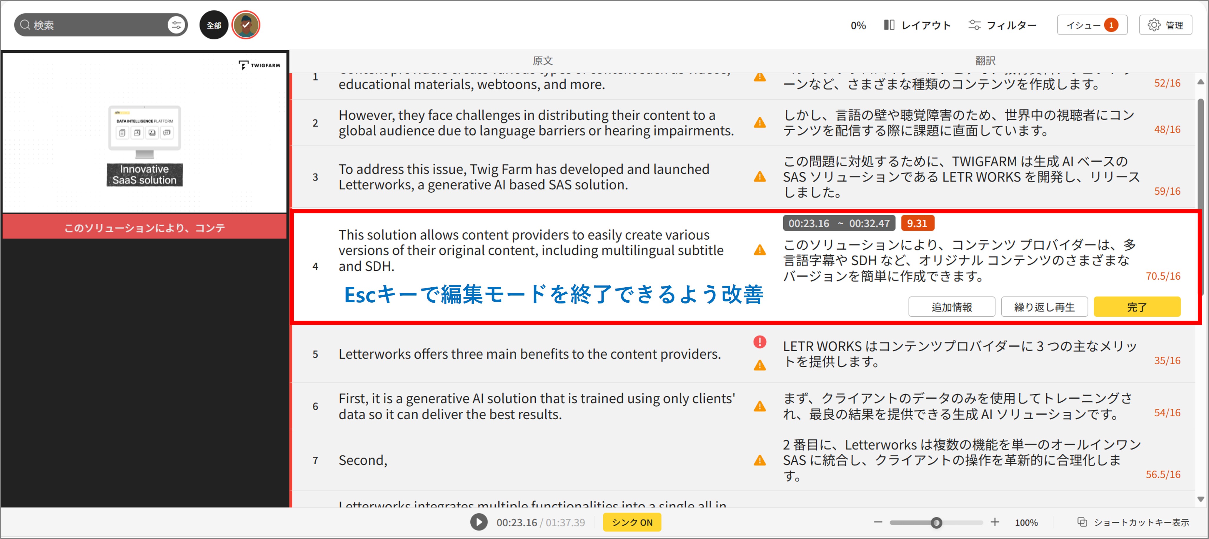 お客様が完了した文の再編集を試みた場合、「進行中」ステータスに変更されるよう改善いたしました。この際、緑色のチェック表示から進行中を意味する「青色」の矢印表示へステータスアイコンが変更されます。