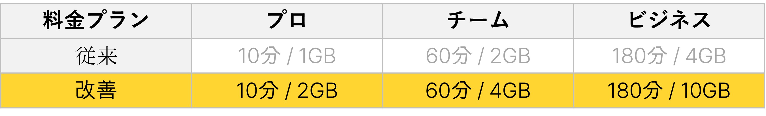 従来は、プロプランが月最大 1,024MB(10分)、チームプランが月最大 2,048MB(60分)、ビジネスプランが月最大 4,096MB(180分)まで映像アップロードが可能でした。