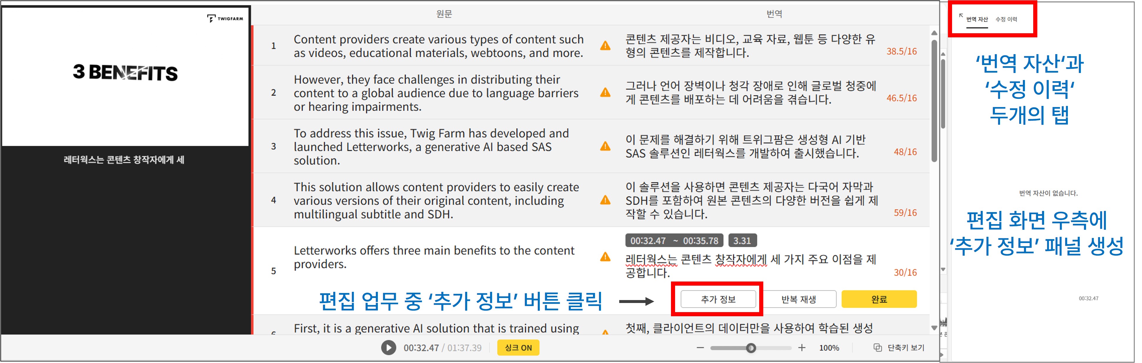 편집 업무 시 ‘추가 정보’ 버튼을 클릭하면 화면 우측에 패널이 생성되며, 패널은 ‘번역 자산’, ‘수정 이력’ 탭으로 구분됩니다.