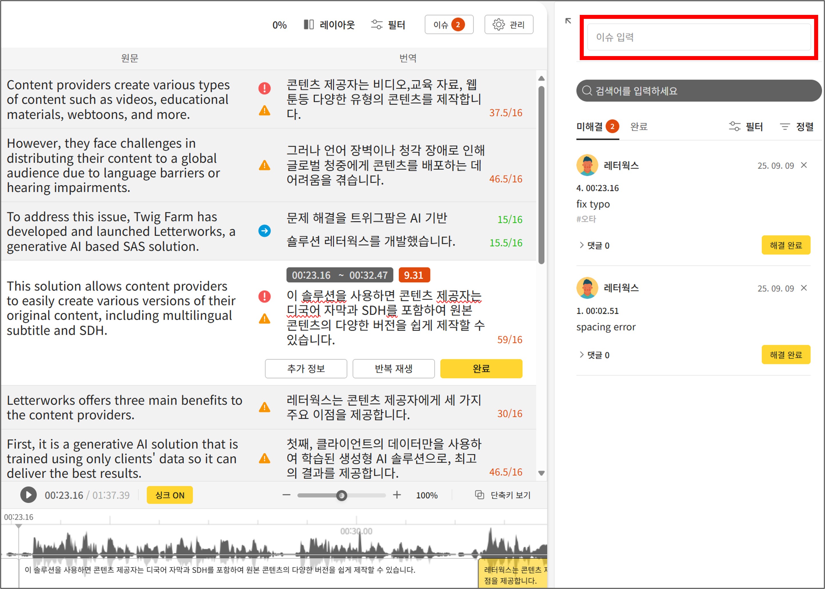 편집 업무 편의를 위해 ‘이슈 입력’ 기능을 편집 화면이 아닌, 패널 화면으로 이동하였습니다. 이제 이슈 사항 입력을 원하신다면 우측 패널 화면 상단의 ‘이슈 입력’ 텍스트 창을 활용해 주세요!