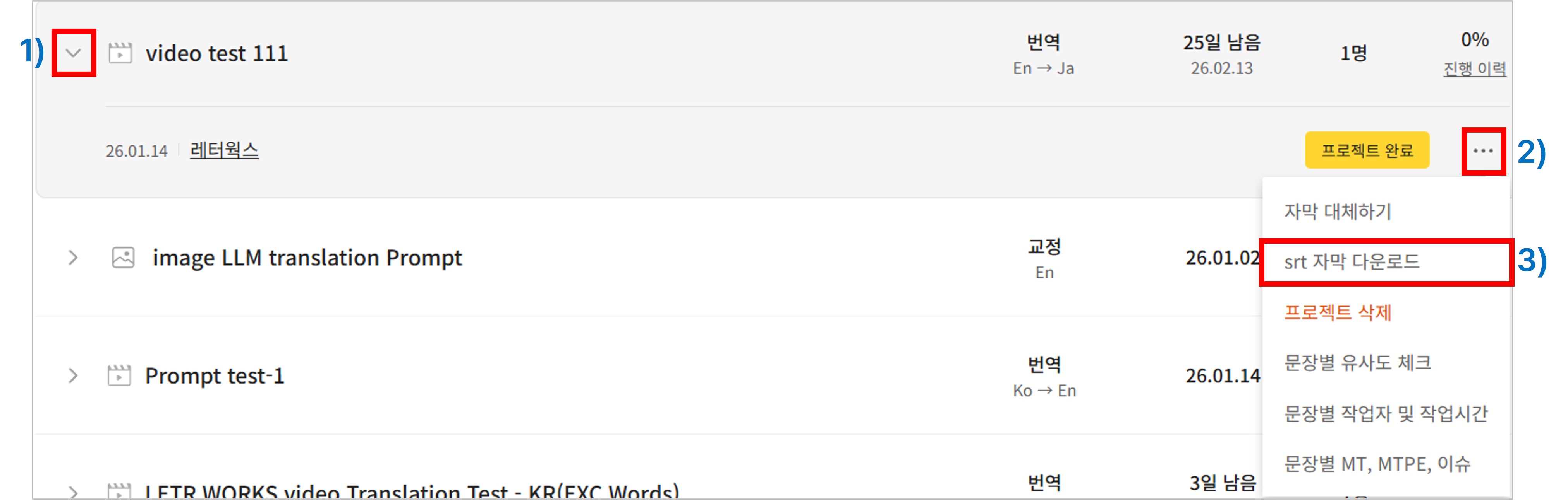 이전에는 프로젝트가 최종 완료된 후에만 자막을 받을 수 있어 불편함이 있었습니다. 이번 업데이트를 통해 프로젝트가 ‘진행 중’인 상태에서도 언제든지 자막을 다운로드할 수 있도록 기능을 개선하였습니다. 해당 기능은 ‘트랜스크립션’(전사) 단계를 제외한 모든 작업에서 활용하실 수 있습니다.